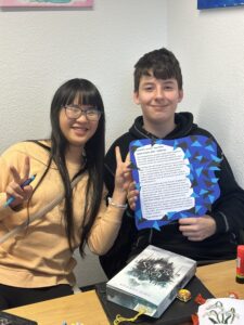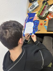 Für das Jugendbuch des letzten Jahres „und die Welt sie fliegt hoch“ von Sarah Jäger und Sarah Maus haben wir zwei Miniaturzimmer gebastelt, jedes stellte den Raum eines der beiden Protagonisten Ava und Juri dar, so wie wir sie in unserem Kopfkino sahen. Die beiden Kistchen schenkten wir nach der Lesung in der Stadtteilbibliothek den beiden Autorinnen. Sie stellten unsere Werke auf ihrer Seite bei Instagram ein und ganz viele User fanden die beiden Fantasieräume ganz cool.