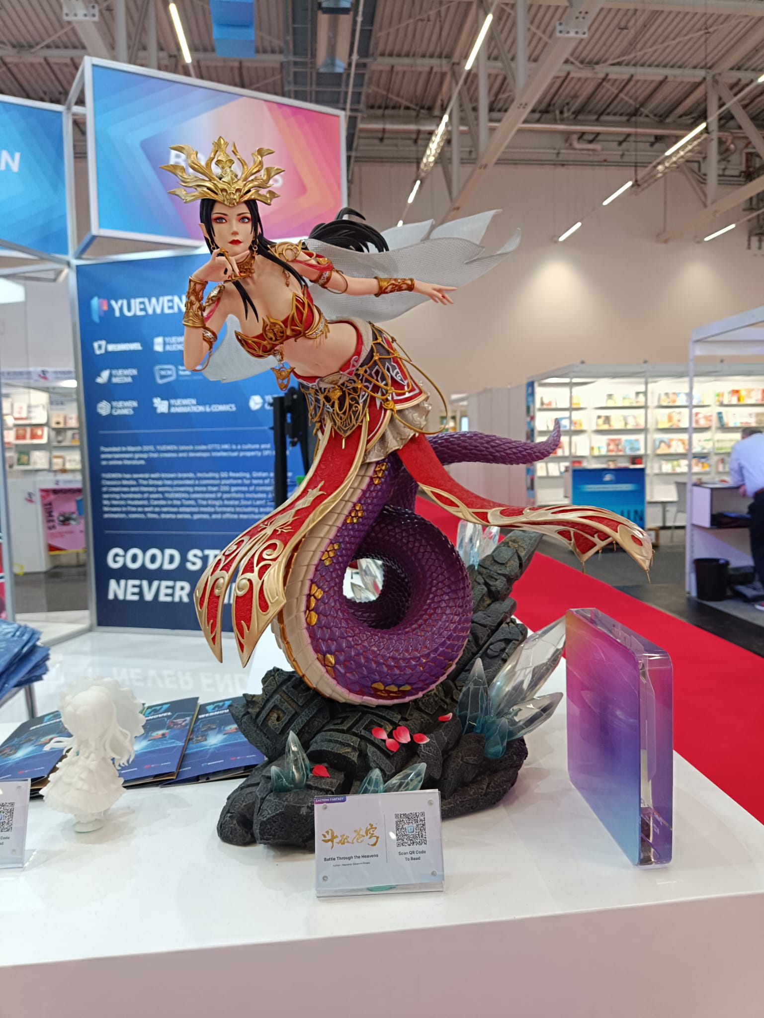 Und auch wir werden wieder reich beschenkt: Bücher können gewonnen werden – und das ist ganz fantastisch, denn kaufen kann man sie an den Fachtagen nicht, sondern erst ganz zum Schluss am letzten Tag, denn einpacken und nach Hause schleppen möchte sie niemand; wir erhalten schöne Tüten und Taschen sowie Kalender und Sticker, auch Küchenmagnete, Radiergummis und Kugelschreiber wie auch Schlüsselanhänger, Perlen, Halbedelsteine und so vieles mehr. Manga- und Tiktokfans kommen auf ihre Kosten und kehren mit Postkarten und Bildern wieder zurück.