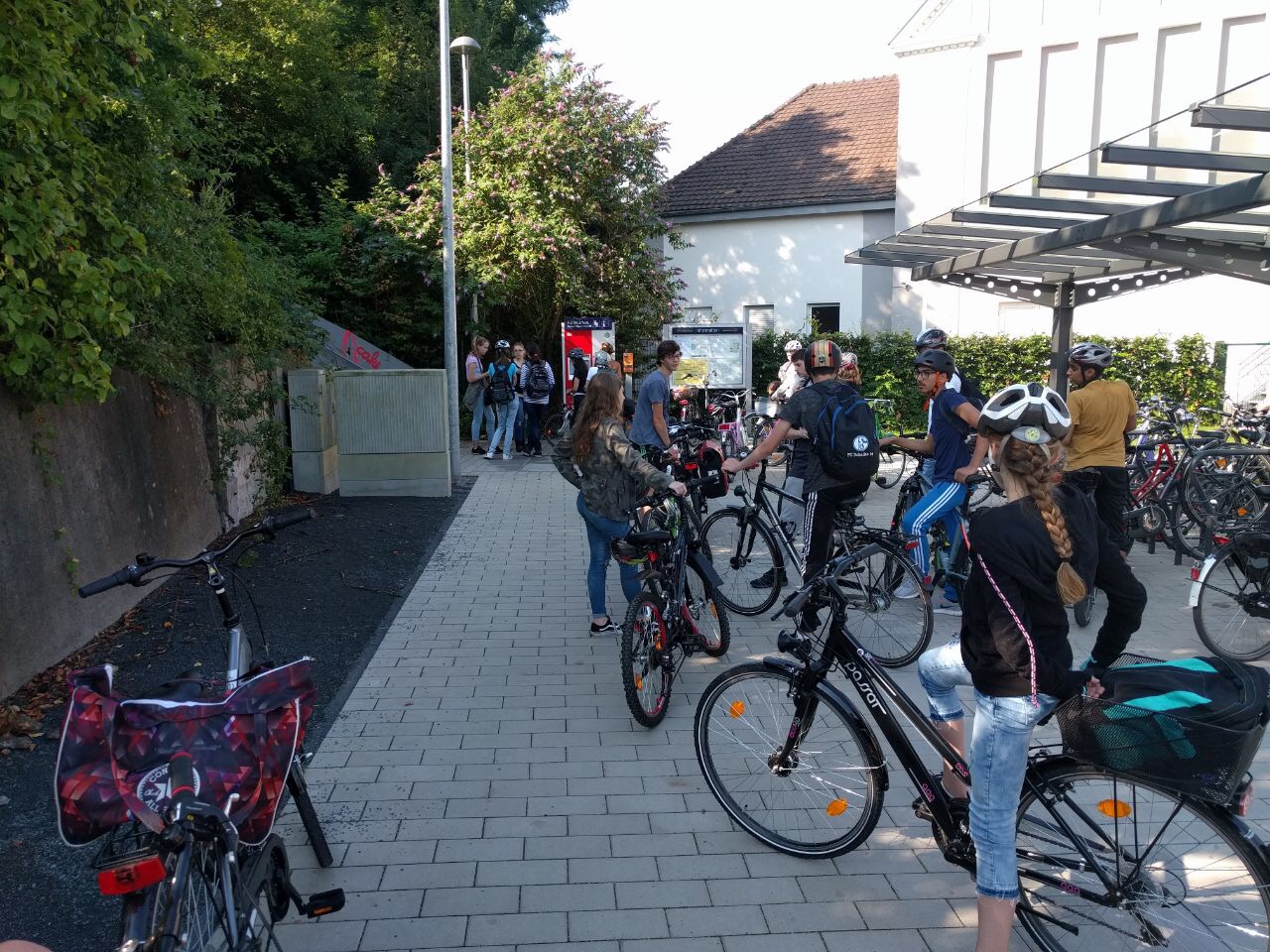 Während Frau Flake und Herr Spinne mit unseren Eltern geredet haben, stellten wir fest, dass ein Schüler schon vor der Fahrt einen Platten hatte. Nachdem Luca half, das Fahrrad zu reparieren, konnten wir nach einem Gruppenfoto und einer fünfzehnminütigen Verspätung im Sonnenschein unsere Radtour antreten.