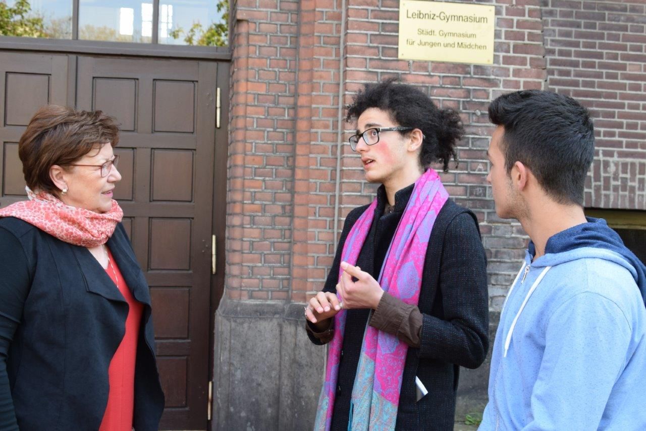 Ab dem Sommer wird der 15-jährige Leibniz-Schüler Miguel Rosete Espin ein Jahr in den USA verbringen. Zurzeit erlebt der gleichaltrige Elias Ephron aus Kalifornien sein Austauschjahr in der Familie von Miguel und besucht in dieser Zeit unser Gymnasium. Für beide Schüler hat die Essener Bundestagsabgeordnete Jutta Eckenbach die Patenschaft übernommen. Nun fand am Montag, 02.05.2016, ein Treffen der Abgeordneten mit ihren Patenkinder im Leibniz-Gymnasium statt.