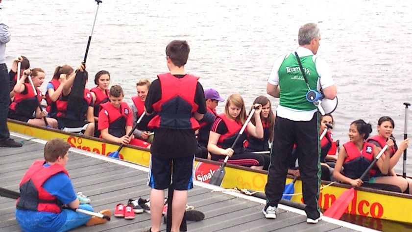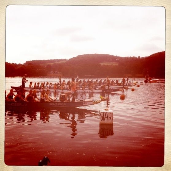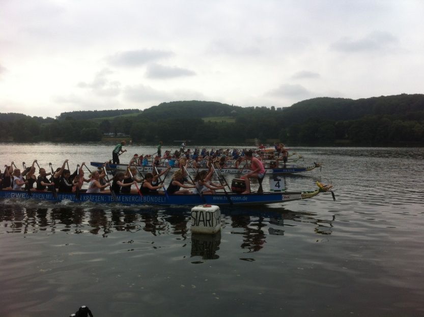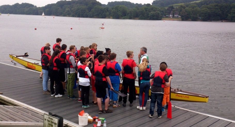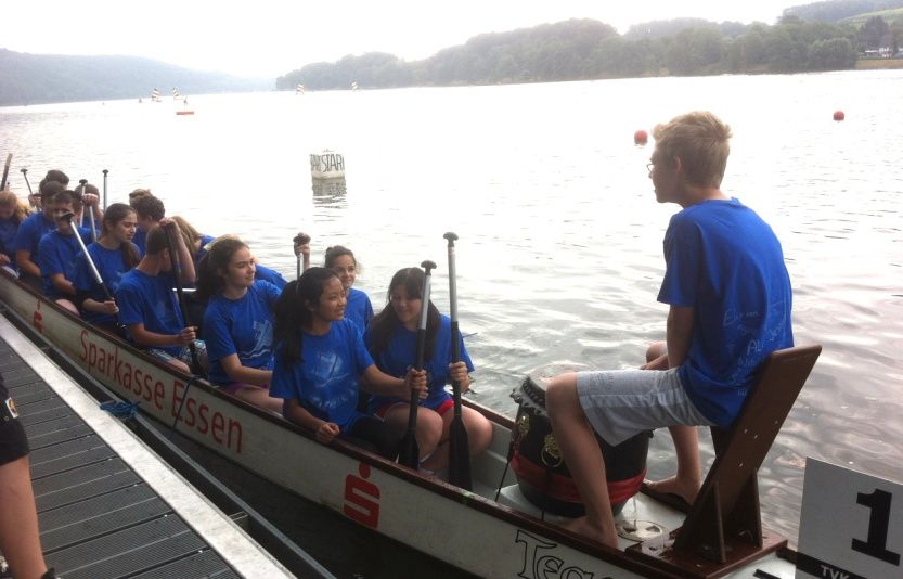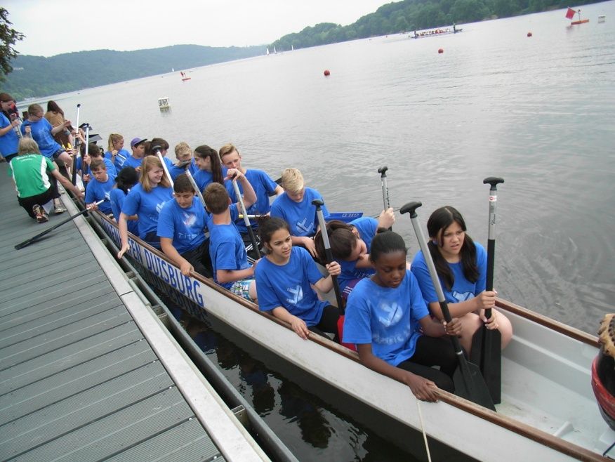Am Donnerstag, den 11.Juli wurde es langsam ernst, denn am Tag darauf sollte schon der Wettkampf stattfinden. Also sind wir zum Baldeneysee gefahren, um die Technik des Drachenbootfahrens zu erlernen. Dazu wurden uns ein Drachenboot und ein Trainer zur Verfügung gestellt. In ein Drachenboot passen zwanzig Ruderer, plus Trommler und Steuermann. So fuhren wir mit neuem Wissen und Vorfreue auf den Tag des Wettkampfes nach Hause.