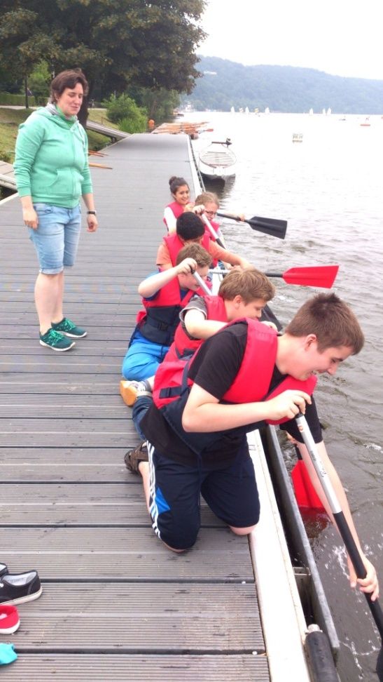 Wir fuhren gemeinsam mit Frau Diepenbrock und unserer Sportlehrerin Frau Blank zum Baldeneysee. Der Wettkampftag besteht aus 2 Vorläufen, in denen man sich für die unterschiedlichen Finalläufe qualifizieren muss. Im dritten Rennen geht es dann konkret um die Platzierung. Obwohl ein Rennen nur 250m und ca. 8-10 min andauert, ist man total geschafft.