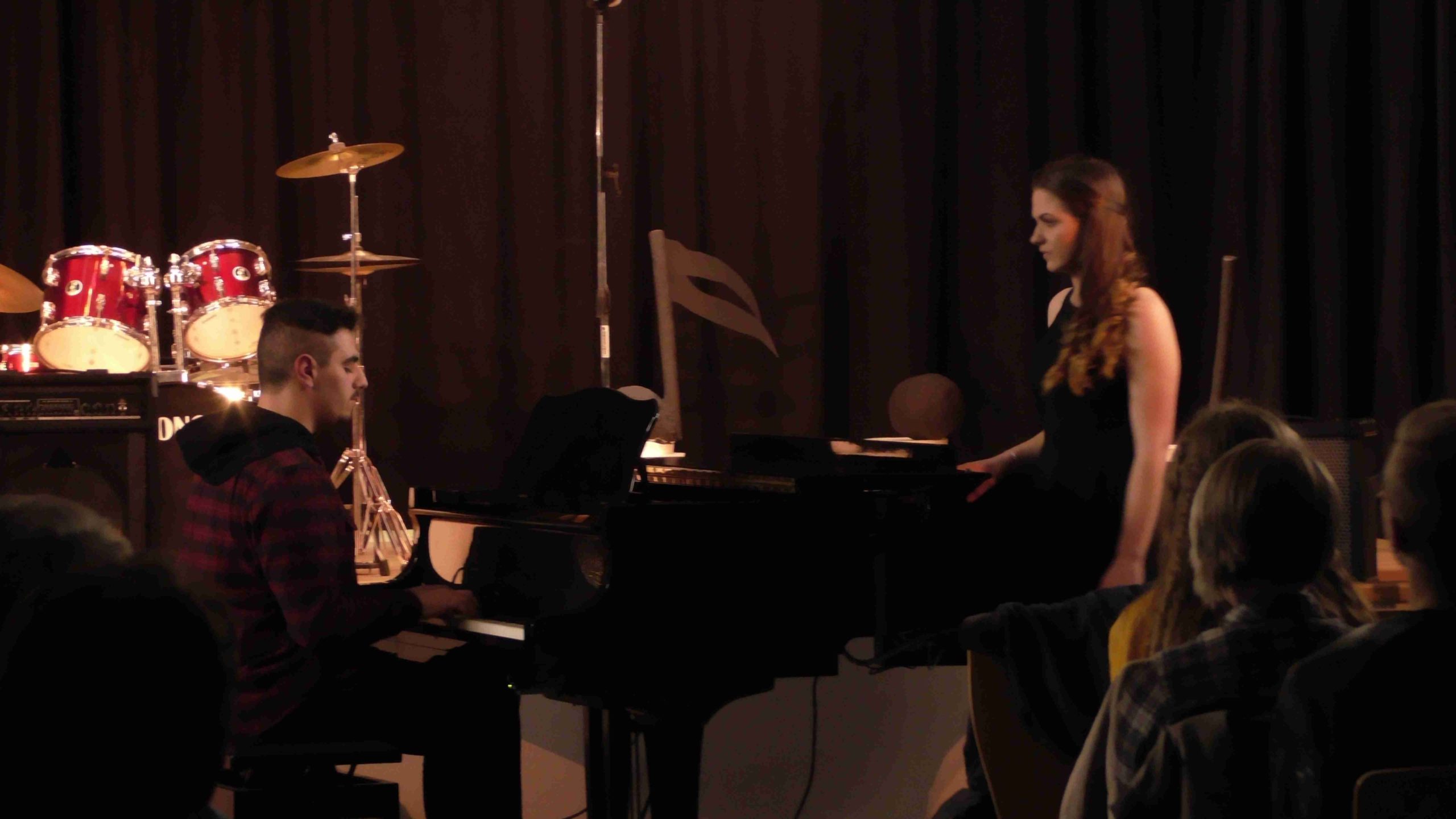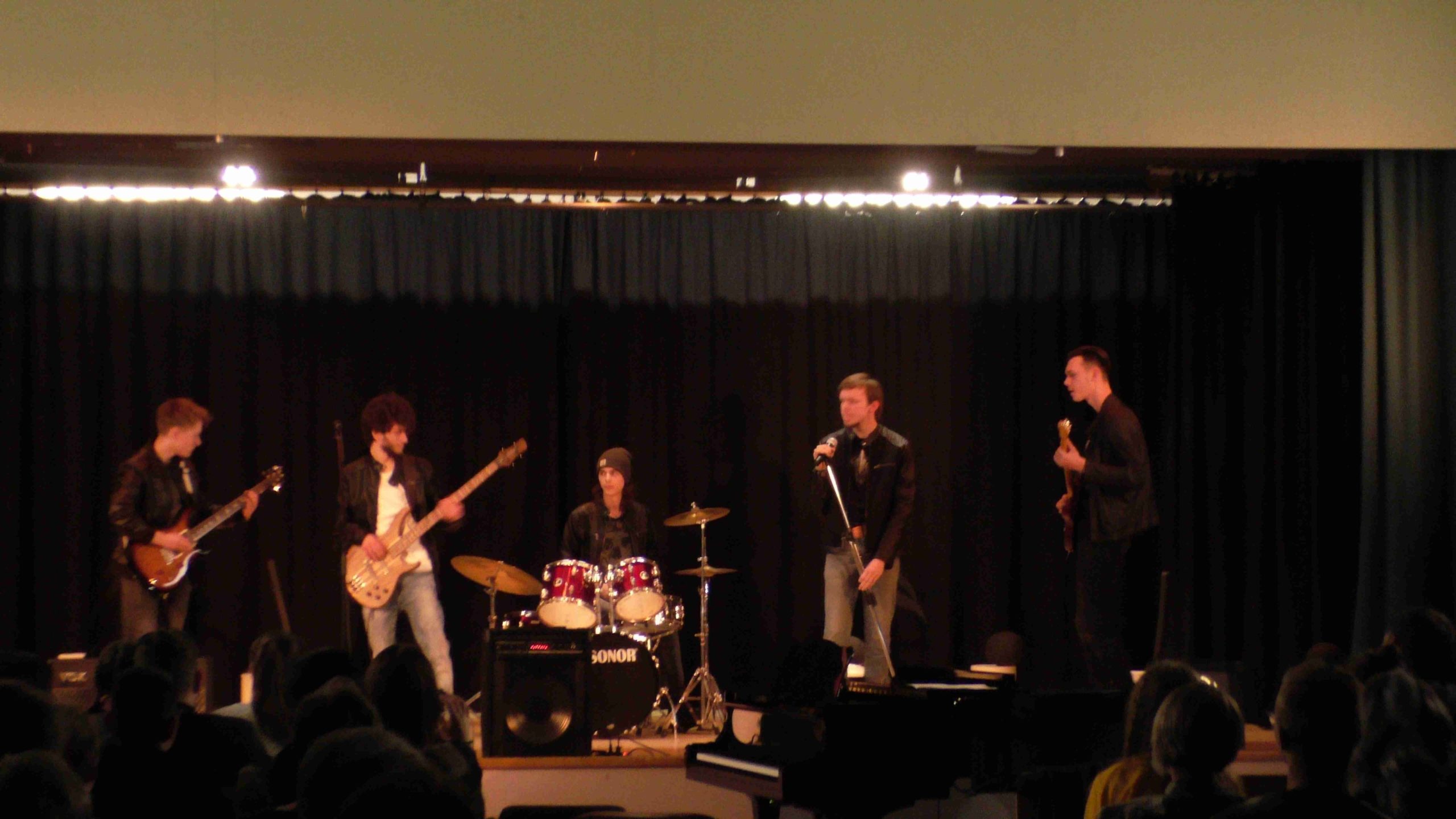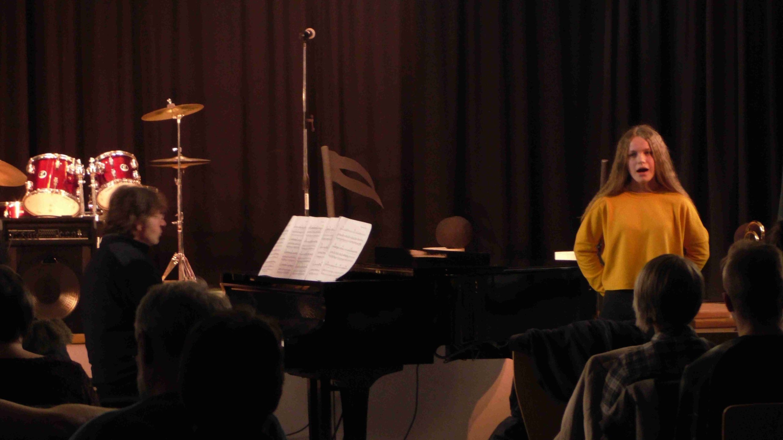 Kalte Finger, zusammengezogene Augenbrauen, fokussierte Blicke – die Konzentration der Aktiven beim Hörpunkt war deutlich spürbar. Mitten in der Mottowoche des Abiturjahrgangs, in der Hochphase von Klassenarbeiten und Klausuren sind viele mit anderen Dingen beschäftigt, als sich der Musik zu widmen. Nicht so allerdings die Aktiven, die in diesem Jahr beim Hörpunkt ihre Lieblingsstücke und -Instrumente vorstellten. Beeindruckend ist die musikalische Vielfalt der Leibnizianerinnen und Leibnizianer; ob Frühbarock oder aktuell, ob geblasen, gesungen oder getastet. Elegant moderiert von Carolin und Hussein verflog die musikalische Stunde wie im Flug. Allen Beteiligten – vor allem den begleitenden Lehrerinnen der Folkwang-Musikschule, die extra gekommen waren – an dieser Stelle noch einmal ein großes „Dankeschön“!