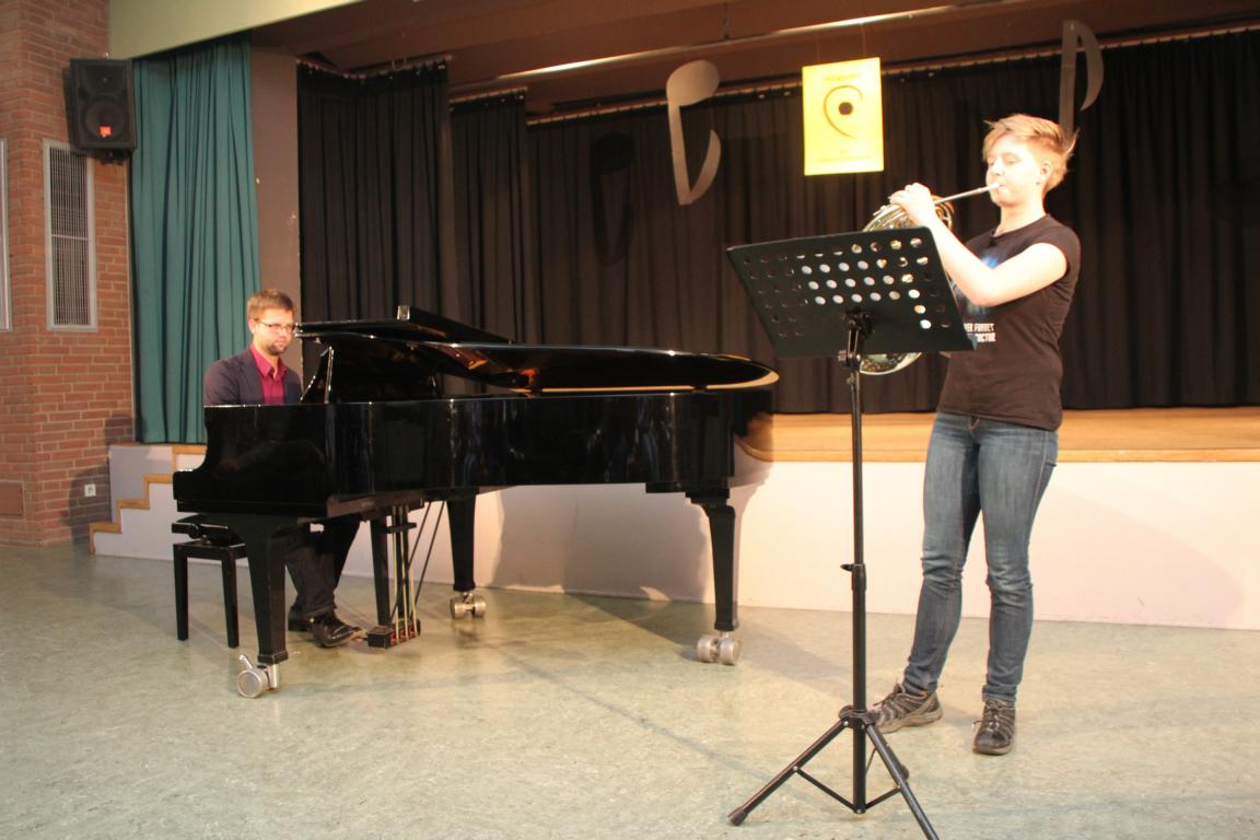 Als zweite Neuheit zeigte sich das Lehrerduo Christina Stahl und Jan Meier, die C. Saint-Säens "Romance für Klavier und Horn" vortrugen und auch die kniffeligsten Stellen problemlos und souverän meisterten. Beide waren während des Konzertes auch immer mal wieder am Klavier als Unterstützung der anderen Solisten zu erleben.