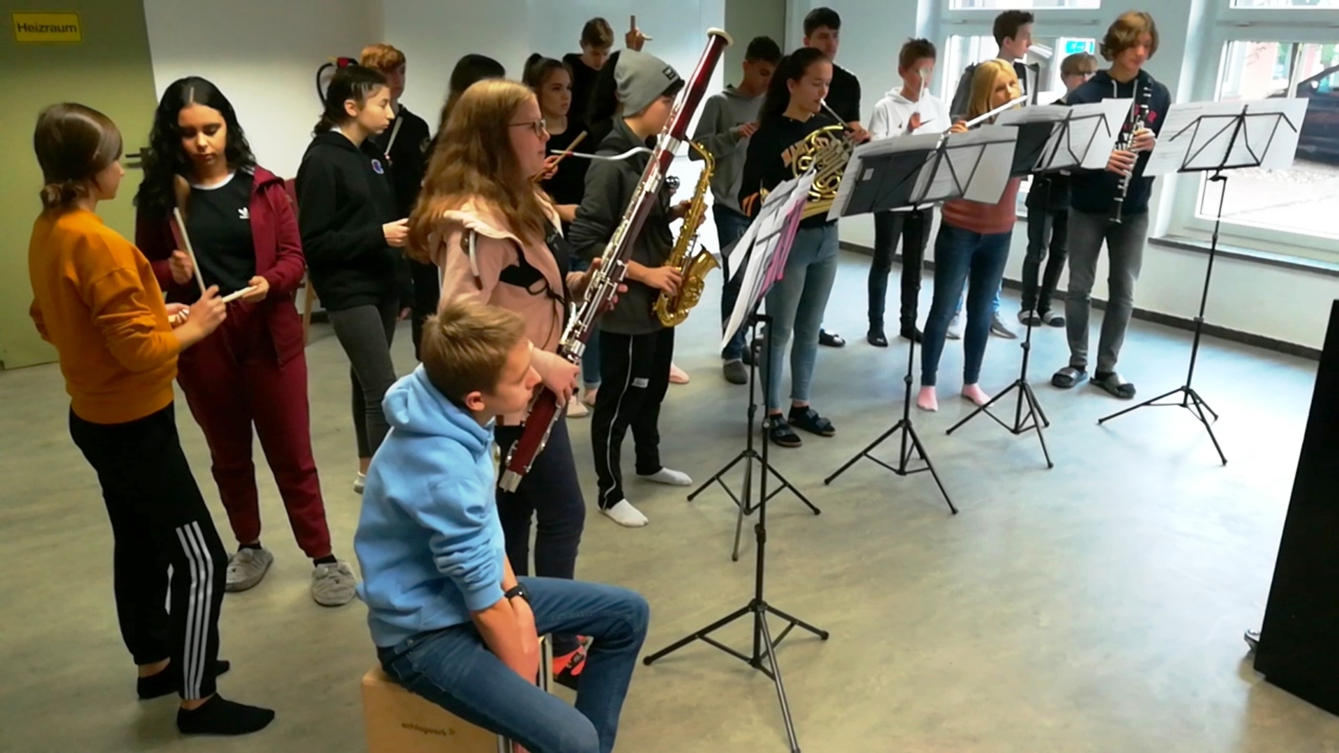 Wir haben mit viel Kreativität selbst Texte auf Englisch und Deutsch zu der Melodie geschrieben, eine Stomp-Version einstudiert und eine Fassung für Blasquintett für Querflöte, Saxophon, Klarinette, Horn und Fagott erarbeitet. Sogar einen RAP haben wir geschrieben. In fünf Gruppen entwickelten wir die Texte sowohl zu biografischen als auch zu musikalischen Themen.