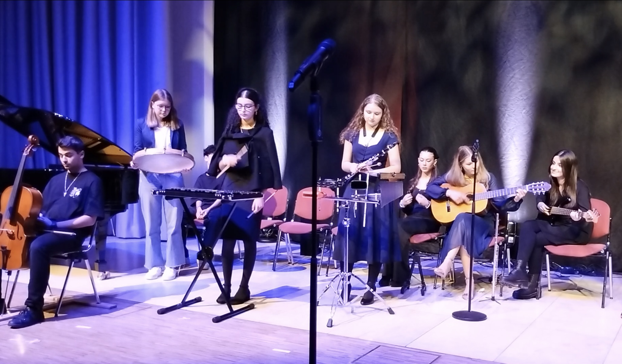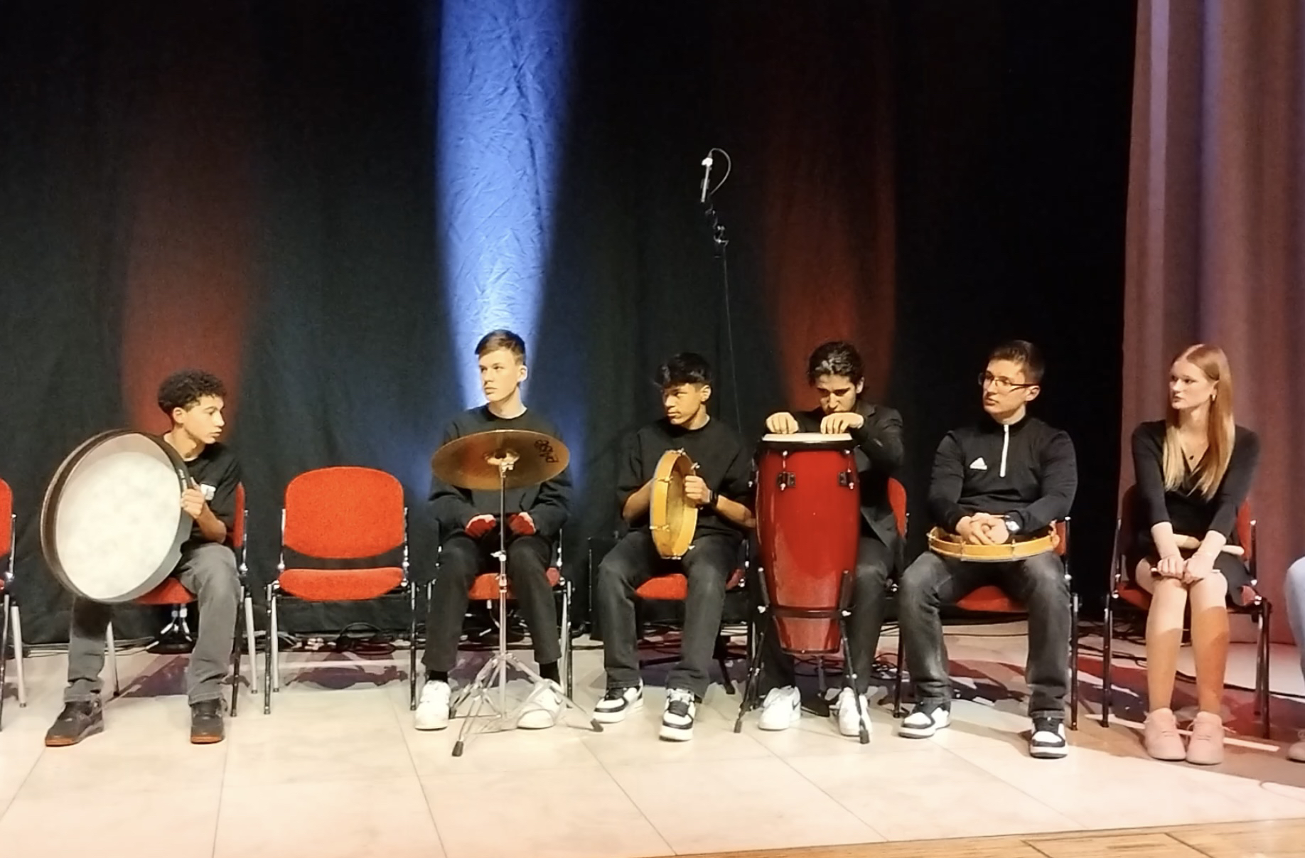 Zusammen mit unserem Musiklehrer Thomas Nieding und den Musikproduzentinnen Alexandra Danshova und Leslie Olsen komponierten wir unsere eigenen Musikstücke. Diese waren inspiriert von den Werken „Lux aeterna“ (ewiges Licht) und einer Weltraum-Odyssee des österreichischen Komponisten György Ligeti. Mit diesen Stücken hatten wir uns ausführlich in den vorherigen Unterrichtsstunden beschäftigt. Die Komposition führte durch eine atemberaubende Reise in fremde Welten, das geheimnisvolle Leben der Tiefsee, machte einen Abstecher ins schwarze Loch und als Abschluss: eine galaktische Exkursion in die Weiten der Unendlichkeit. Die Hauptthemen konnten wir während der Musikstunden erarbeiten. Dort lernten wir neue Instrumente wie Cello, E-Bass, Keyboard, Gitarre etc. zu spielen, entdeckten neue Klänge, ließen unserer Kreativität freien Lauf und komponierten so unser eigenes Werk. Eine weitere Inspiration bekamen wir in einem Konzert am 01.11.2023 in der Philharmonie. Dort wurden die Stücke von György Ligeti zum Anlass seines 100. Geburtstags vorgeführt. Außerdem wurden noch weitere Werke gezeigt, in denen gewöhnliche Instrumente, wie zum Beispiel eine Violine, auf die unterschiedlichsten Weisen gespielt wurden. Dadurch ließen sich völlig neue Klänge erzeugen. Es wurden aber auch mit Alltagsgegenständen, wie z. B. Blumentöpfen, Töne gespielt, was wir für unsere Stücke ebenfalls aufgriffen. Der Abschluss dieses Projektes war das „Sound LAB“ Konzert am 19.01.2024 im RWE-Pavillon der Philharmonie. Gefördert von der Kunststiftung NRW und geleitet von Leslie Olsen. Dort stellten wir zusammen mit der Hauptschule an der Wächtlerstraße, der Theodor-Fliedner-Schule und der Glückauf-Schule Essen unsere Werke vor.
