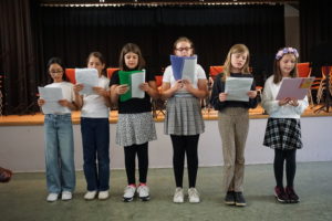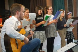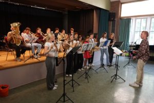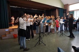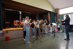 Ungewöhnlich für unsere Bläserkonzerte waren die Auftritte von „Special Guests“. Der Unterstufenchor (Leitung: Herr Kronenberg) beeindruckte mit großem Stimmvolumen, als er „Unstoppable“ von Sia und ein Lied von Max Raabe sang. Die Songprojekt-AG des Leibniz-Gymnasiums (Leitung: Frau Fenner und Herr Hartogh) stellte ihr AG-Ergebnis, den selbst geschriebenen Videoclip „Das Beste hier“, vor.