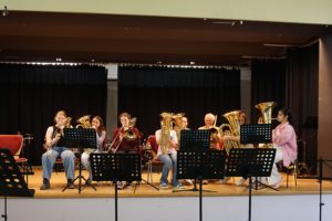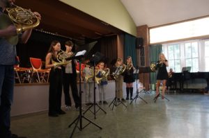 Ebenfalls im Programm verteilt traten dieses Mal drei Blechbläser-Ensembles auf: Die Tiefblechgruppe (Klasse 6 und höher, Leitung: Herr Fassbender) und die Trompetengruppe der Klasse 6 (Leitung: Herr Gerstel) spielten dreistimmige Stücke aus ihrem Repertoire, während die Horngruppe des Leibniz-Gymnasiums Spieler aus sechs verschiedenen Jahrgangsstufen vereinigte, die schöne Interpretationen von zwei Volksliedern („Ein Männlein steht im Walde“ und „Wenn ich ein Vöglein wär“) präsentierten.