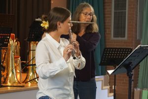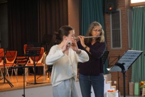 Auch die Programmgestaltung stand dieses Mal im Zeichen der Verabschiedung: Mehrere Schülerinnen von Frau Mallus zeigten in Ensembles, was sie gelernt hatten, und würdigten ihre Lehrerin somit auf musikalische Weise. Lilian Schumann und Elisabeth Springer sowie Annika Schmitt spielten dabei Duette aus der Mozart-Oper „Die Zauberflöte“. Maya Enders interpretierte, ebenfalls mit Frau Mallus, ein Rondeau von Johann Sebastian Bach, und Greta Hahnenberg spielte, begleitet von Michael Kronenberg an der Gitarre, ein grandioses Sicilienne von Gabriel Fauré.
