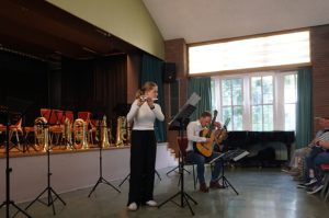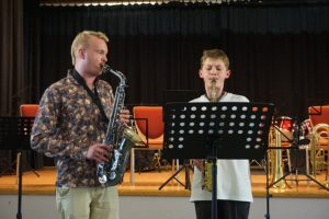 Zwischen den Orchestern traten die kleineren Ensembles auf, zu denen neben den Flöten-Duetten auch ein Saxophon-Duett von Vitalii Kaminski und seinem Lehrer, Herrn Köhler, gehörte. Sie interpretierten das „Jazz-Duet for Saxophone No. 2“ von Lennie Niehaus.