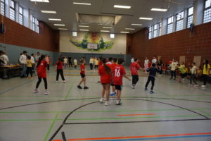 Um 9 Uhr fingen die Spiele an: Die Turnierleiter starteten das Spiel. Alle Klassen spielten abwechselnd gegeneinander. Die Schülerinnen und Schüler vertraten ihre eigene Klasse und trugen dabei die entsprechende Klassenfarbe (Rot, Gelb, Grün, Blau, Weiß). Nach 15 Minuten Spielzeit wurden die Klassen getauscht. Die vier Linienrichterinnen und Linienrichter achteten auf die Grenzen des Spielfelds und sorgten für genügend Freiraum für die Spielerinnen und Spieler. Zwei Schiedsrichter, positioniert an den Enden der Mittellinie, behielten das gesamte Spiel im Auge. Sie legten Wert auf das Einhalten der Spielregeln und halfen den Kindern, wenn sie eine neue Position bekamen, wie das Innenfeld oder das Außenfeld. Einige Kinder hielten sich nicht an die Regeln, was zu Unstimmigkeiten mit den Schiedsrichtern führte. Diese wurden jedoch sachlich und friedlich geklärt. Nachdem die Turnierleiter das Spiel beendet und die Punkte des Spiels eingetragen hatten, hatten die Kinder eine kurze Pause, während eine andere Klasse spielte. Sanitäterinnen und Sanitäter waren ebenfalls anwesend, um den Kindern bei Verletzungen zu helfen. Jede Klasse hatte ihre eigenen (2-3) Sporthelferinnen und Sporthelfer. Sie beantworteten Fragen der Schülerinnen und Schüler, wenn nötig, und unterstützten sie. Die Sporthelferinnen und Sporthelfer feuerten die Kinder während des Spiels an und halfen ihnen auch beim Navigieren innerhalb des Spielfelds. Die Kinder befolgten die Anweisungen der Sporthelferinnen und Sporthelfer, wie zum Beispiel bei Aufstellungen oder Besprechungen. Nach der Siegerehrung spielten die Mitglieder des Kurses zusammen mit den Kindern der Klassen, bis sie entlassen werden durften. Die Wertsachen wurden den Klassen am Ende von den jeweiligen Sporthelferinnen und Sporthelfern zurückgegeben, und die Kinder begaben sich zurück zu ihren Lehrerinnen und Lehrern.