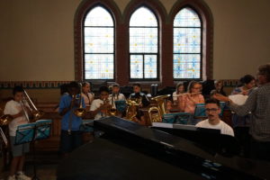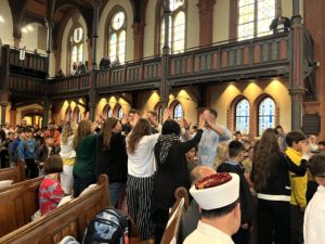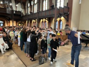 Die Religionsschüler*innen gestalteten zusammen mit den Klassenpat*innen, der 6er-Bläsergruppe unter der Leitung von Herrn Lutz, der musikalischen Unterstützung von Herrn Bargiel und den Klassenlehrkräften einen tollen Gottesdienst: Sorgen, die sich in Form von Steinen in Schulrucksäcken breit gemacht hatten, wurden hinausgeworfen, um viel Platz für gute Wünsche zu schaffen und die Lehrerkräfte bildeten einen „Torbogen“, durch den die 5.-Klässler*innen in einen riesigen Willkommenskreis schritten, der ihnen einen Vorgeschmack auf das kunterbunte Leibniz-Leben gab.
