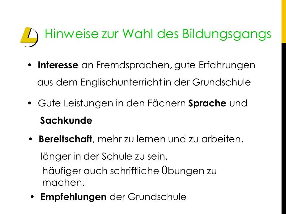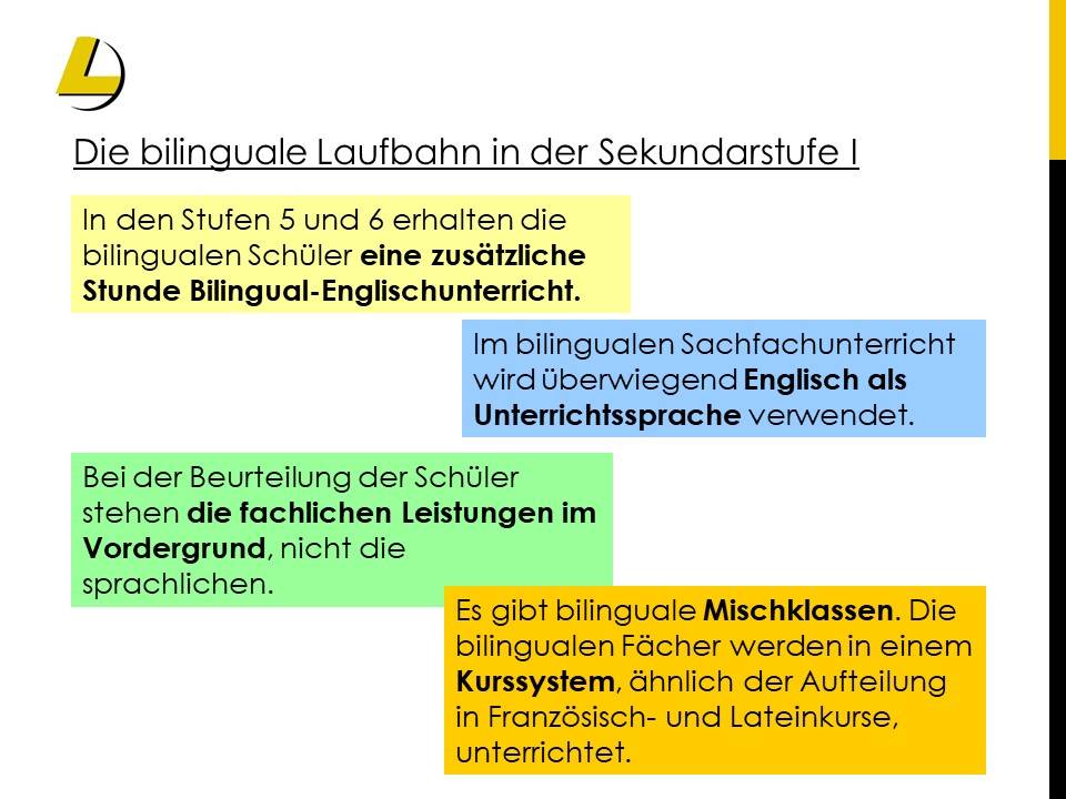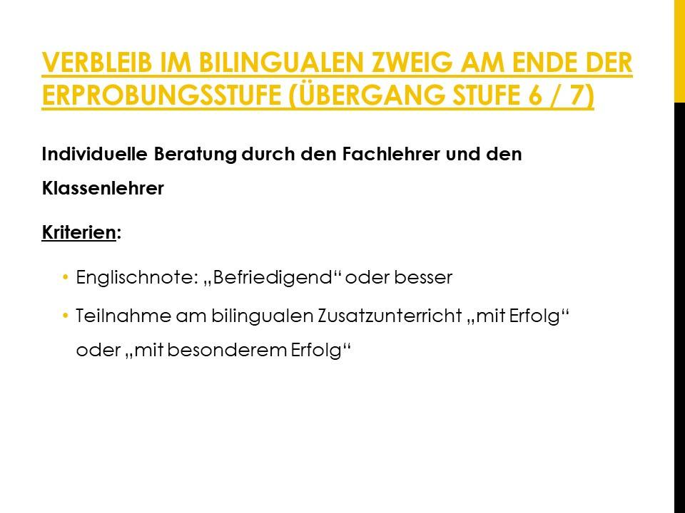 Am Ende der Erprobungsstufe (nach Klasse 6) wird über den Verbleib im bilingualen Bildungsgang entschieden. In der Regel setzen nur diejenigen Schülerinnen und Schüler, die im Fach Englisch mindestens die Leistungsnote „befriedigend“ erreicht haben und denen die Teilnahme am englischen Zusatzunterricht „mit Erfolg“ oder „mit besonderem Erfolg“ bescheinigt wird, die bilinguale Laufbahn in der Stufe 7 fort. Der bilinguale Unterricht wird ab Jahrgangsstufe 7 erteilt von Lehrerinnen und Lehrern mit der Lehrbefähigung für das jeweilige gesellschaftswissenschaftliche Fach in Kombination mit Englisch. Alle anderen Fächer sind, auch in den bilingualen Klassen, weder in ihrer Wochenstundenzahl noch in ihren fachlichen Richtlinien betroffen. Die tabellarische Übersicht über den bilingualen Bildungsgang verdeutlicht, dass Schülerinnen und Schüler dieses Zweigs in einigen Jahrgangsstufen größere zeitliche Belastungen und ein erhöhtes Arbeitspensum zu bewältigen haben. Dies bedeutet, dass neben guten sprachlichen Leistungen im Deutschen und einem großen Interesse an Fremdsprachen vor allem Ausdauer, Konzentrationsvermögen und eine gute Arbeitshaltung wichtige Voraussetzungen für die erfolgreiche Absolvierung dieses Bildungsgangs sind. Vor der Fortsetzung in der gymnasialen Oberstufe findet eine verpflichtende Beratung statt.