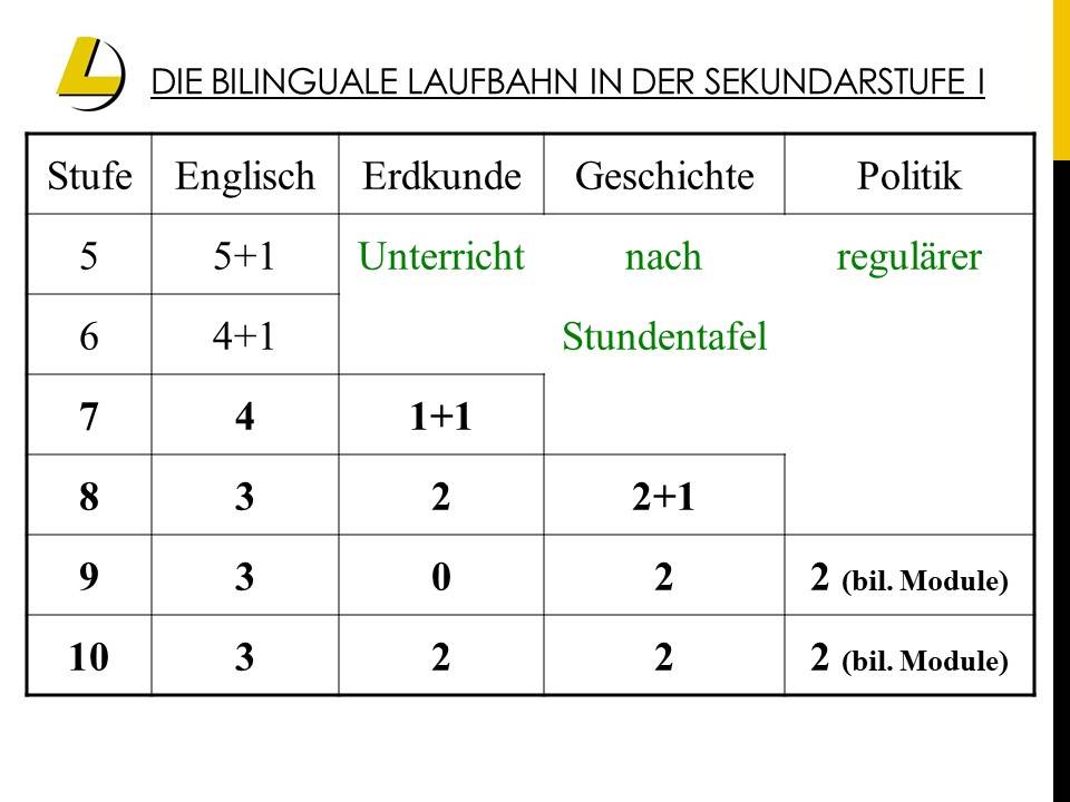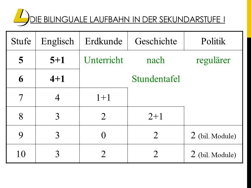 In den Jahrgangsstufen 5 und 6 wird der Englischunterricht nach der Stundentafel vierstündig unterrichtet. Er wird für die bilingualen Gruppen um eine Wochenstunde erweitert, um die Schülerinnen und Schüler auf die sprachlichen Anforderungen des fremdsprachlichen Sachunterrichts vorzubereiten. Der planmäßige Erdkunde- und Geschichts-unterricht wird in diesen Stufen auf Deutsch abgehalten. Die Tabelle gibt eine Übersicht über das stufenweise Einsetzen bilingualer Fächer in der Sekundarstufe I und über die Fortsetzung des bilingualen Bildungsgangs in der Sekundarstufe II. Sie finden hier die reguläre Wochenstundenzahl der Fächer in den verschiedenen Stufen und die zusätzliche Stundenzahl für die bilingualen Schülerinnen und Schüler: