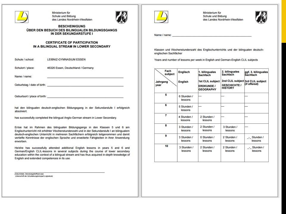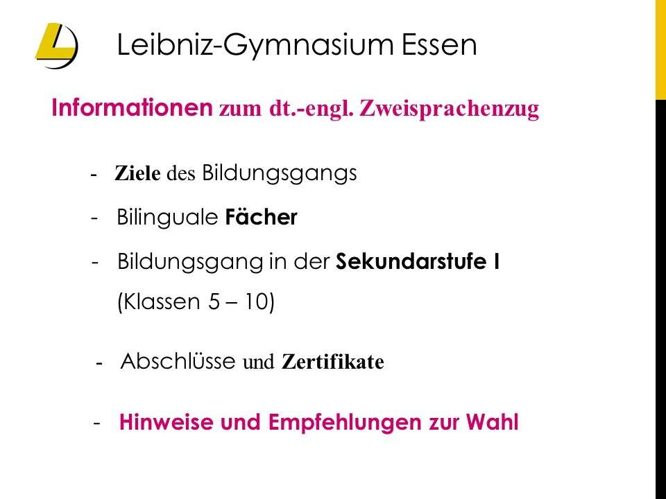 Für weitere Informationen stehen Ihnen die Schulleitung und die Leitung des Zweisprachenzuges Deutsch – Englisch am Leibniz-Gymnasium Essen zur Verfügung.