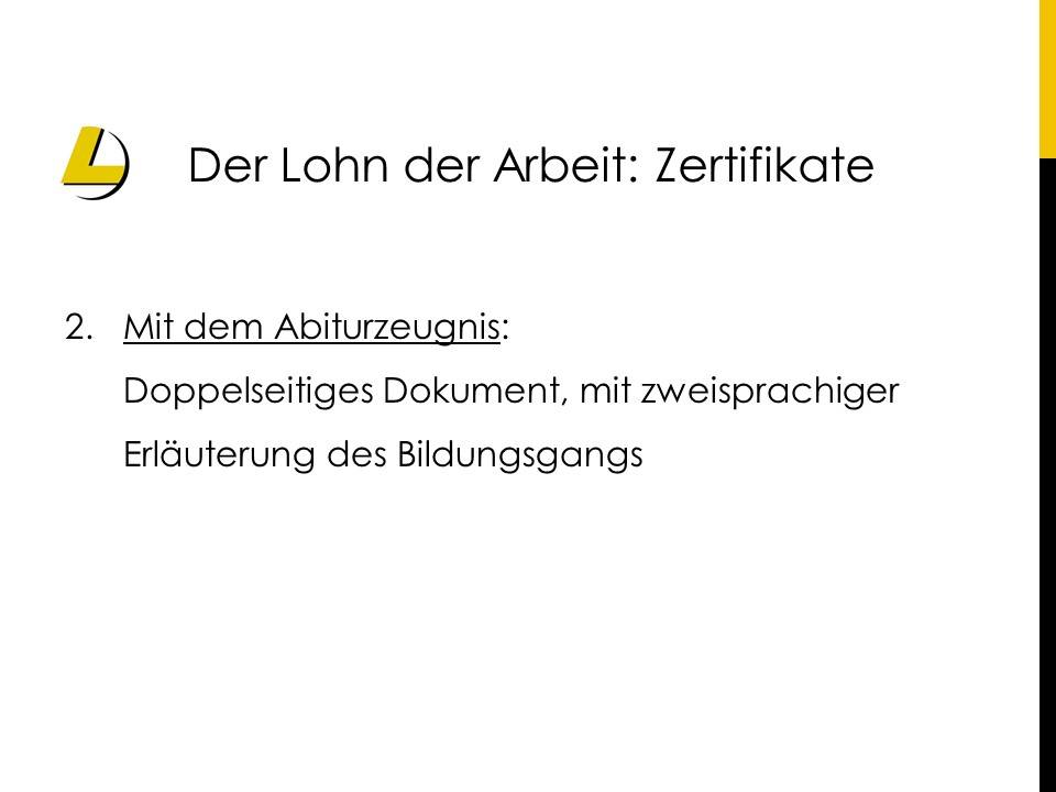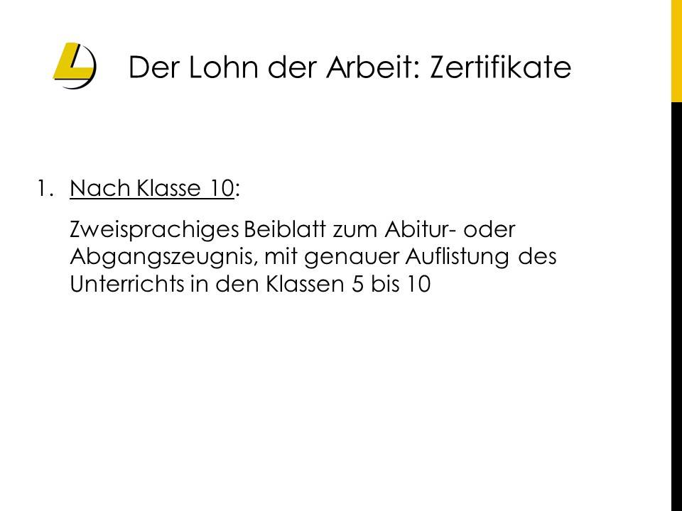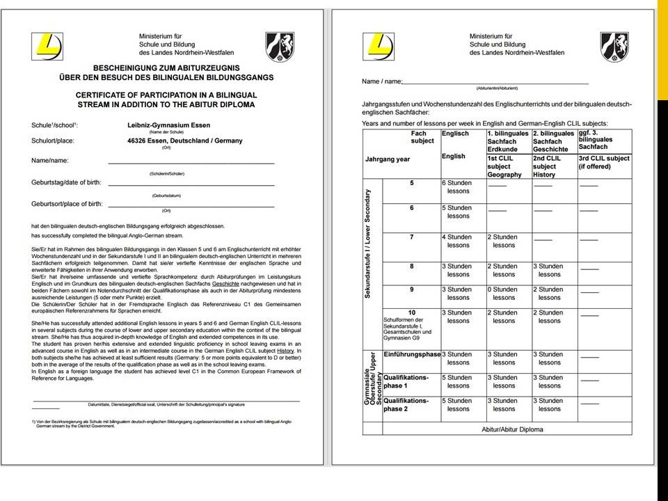 Der erfolgreiche Abschluss der bilingualen Laufbahn wird in einem besonderen zweisprachigen Zertifikat bescheinigt, das mit dem Abiturzeugnis ausgehändigt wird und manchen Weg in Studium und Beruf im englischsprachigen Ausland ebnet.