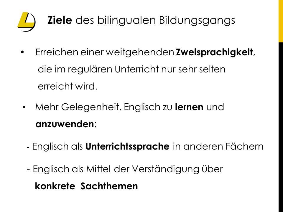 Bilingualer Unterricht dient der Zielsetzung, die fremdsprachlichen Fähigkeiten der Schülerinnen und Schüler dadurch zu fördern, dass die erlernte Fremdsprache bereits zu einem möglichst frühen Zeitpunkt (ab Klasse 7) als Unterrichtssprache in einigen Sachfächern verwendet wird.